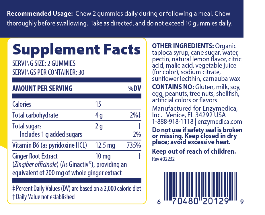 Calories 15, Total Carbohydrate 4 g, Total Sugars 2 g (Includes 1 g Added Sugars), Vitamin B6 (as pyridoxine HCL) 1.25 mg, Ginger Root Extract 10 mg (Zingiber officinale; providing equivalent of 200 mg whole ginger extract)